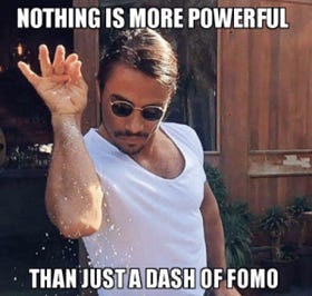 Fear of missing out or FOMO is defined as a "pervasive apprehension that others might be having rewarding experiences from which one is absent." It is driven by the desire to stay continually connected with what others are doing. Scarcity can sometimes be a function of FOMO. It is heavily predicated on the idea that others desire the product/service and that you have to act now to get in on the goods.